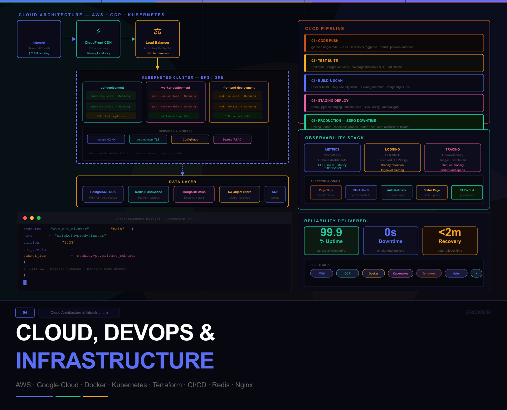 What this includes:AWS & GCP architecture · Docker containerization · Kubernetes orchestration · CI/CD pipeline setup · Redis caching · Nginx configuration · Auto-scaling & load balancing · Infrastructure as code (Terraform) · Monitoring & alerting · Database management & backups · Zero-downtime deployment strategy